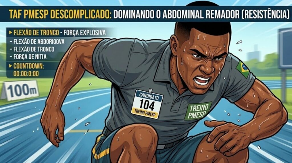 O edital DP-2/321/25 é muito claro: o teste é de resistência abdominal na modalidade remador, e a execução correta é rigorosamente observada pelos avaliadores. Um movimento errado e você pode ouvir o temido “Não contei!” – e cada repetição não contada pode significar a sua eliminação.